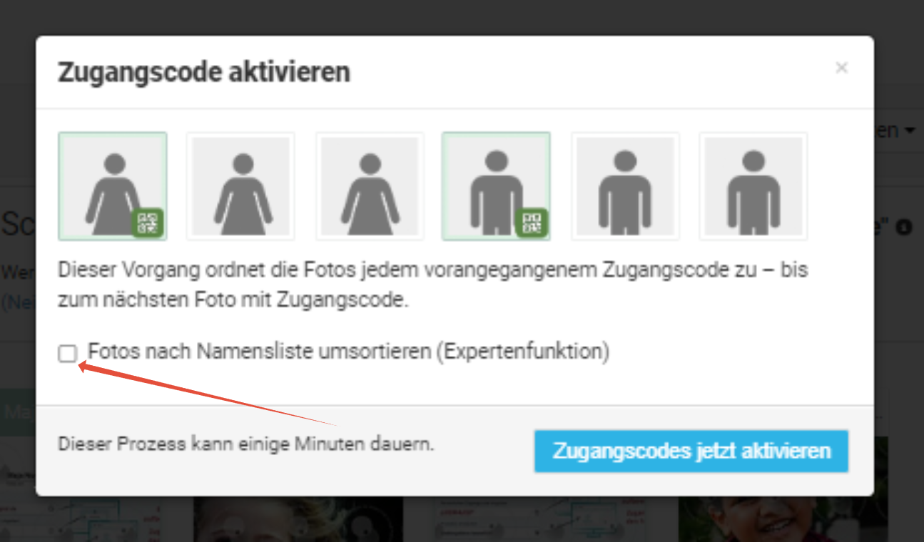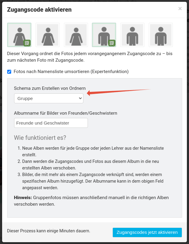 Wenn du die Zugangscodes bereits aktiviert hast, kannst du unter Einzelpersonen verwalten > Fotos auf Alben verteilen die Sortierung nachholen oder die Aktivierung zurücksetzen.