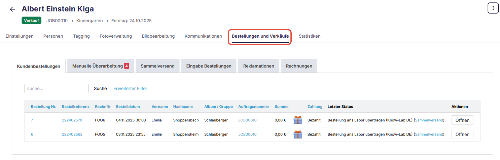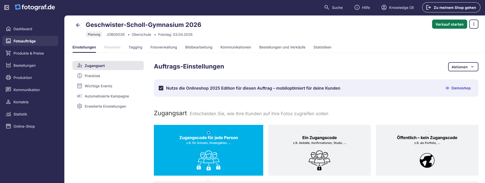 - Kontakte: Verwalte hier Käufer:innen und potenzielle Kund:innen, Schüler:innen/Fotosubjekte, Auftraggeber:innen und Kundenlöschanfragen.