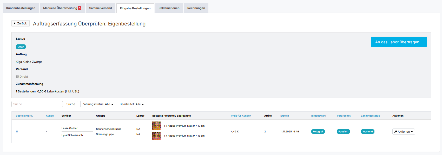 Wenn du z. B. dem Team einer Kita jeweils einen kostenlosen Abzug ihres Einzelfotos anbieten möchtest, kannst du alternativ auch die Eingabe Bestellungen dafür nutzen, um deine zusätzlichen Kosten gering zu halten: