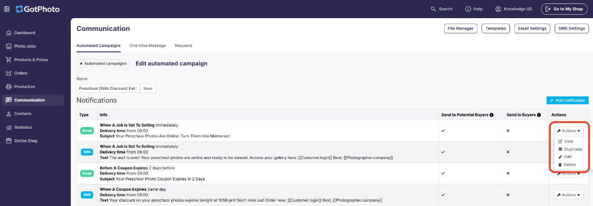 GotPhoto's automated campaigns make it easy to send timely, targeted messages to customers with minimal effort. Whether you're starting fresh or customizing existing templates, these campaigns can be reused and tailored to fit any photo job.