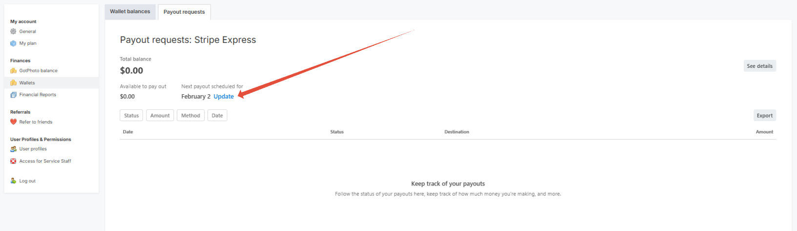 Request an instant payout: Instant Payouts can be requested from the GotPhoto admin areas, via the Payouts page. By clicking the "Pay Out" button, you will be able to choose the Instant Payout option if available.
